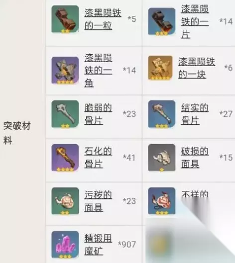 尘世之锁突破至满级,需要用到的材料: 漆黑陨铁的一粒5个、一片14个、一角14个、一块6个,脆弱骨片23个、结实的骨片27个、石化的骨片27个,破损的面具15个、污秽的面具23个、不祥的面具27个,精锻用魔矿27个、摩拉1131445。
