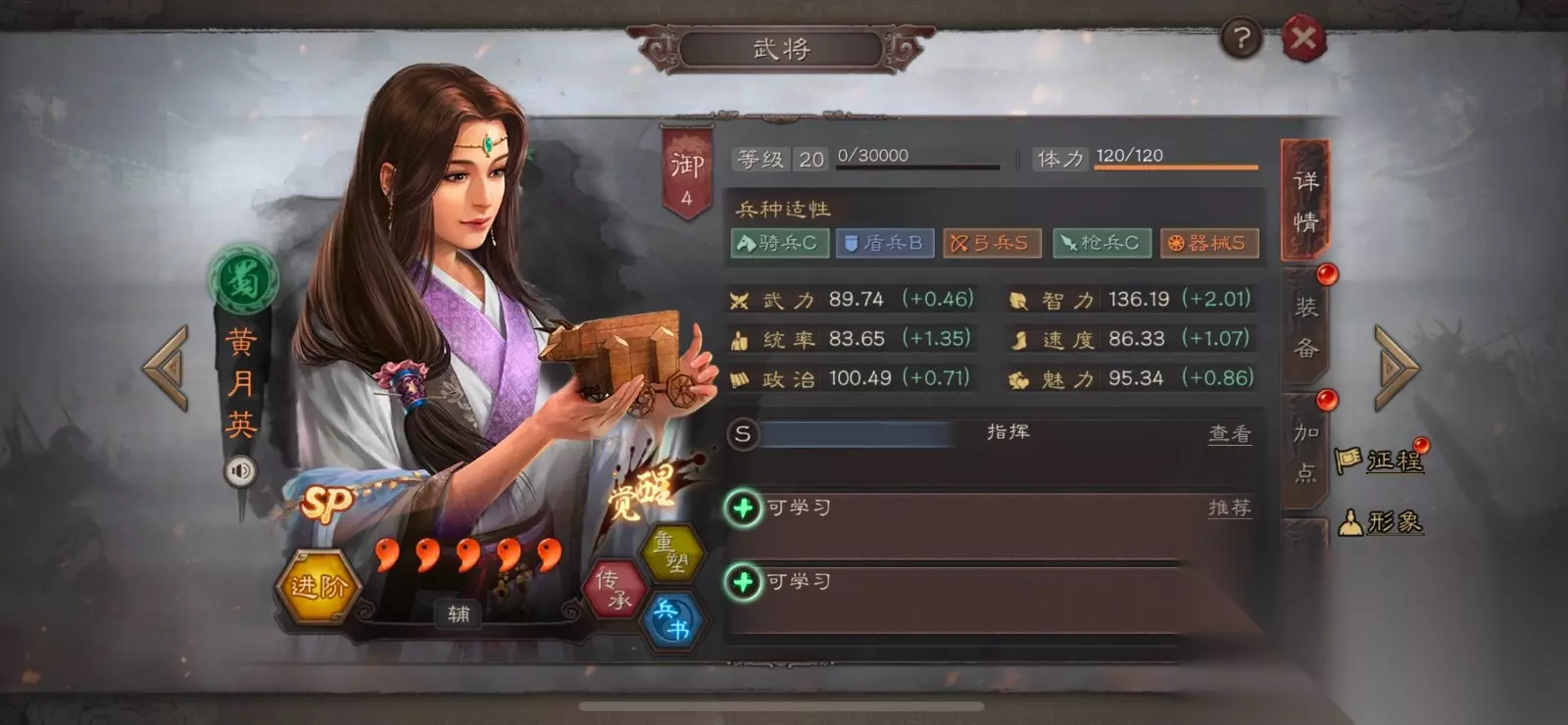 黄月英是先手爆发流阵容的核心辅助,她的价值不在于属性输出,而在于功能性加持。“工神”能让我方全体在前三回合获得先攻状态并提升伤害,第四到第五回合还能降低敌方所受伤害。不过她只有器械兵种适性为S级,其他兵种上阵会降低30%属性。因此更适合搭配辅助类战法,以支援角色定位活跃在战场。