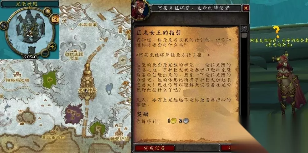 在龙骨荒野的龙眠神殿寻找阿莱克丝塔萨,生命的缚誓者。此任务完整发生于龙骨荒野。 任务描述:我们对安加萨的进攻让天灾军团乱了阵脚,但仍然没有露出什么破绽。他们派出了冰霜巨龙向我们狂轰滥炸,使得我们在天灾之门不能再前进半步。我们必须阻止冰霜巨龙的攻击,不过在我们解决这些古代巨龙的骨架之前,必须获得他们女王的许可。去东南方的龙眠神殿寻找阿莱克丝塔萨女王。告诉她我们必须这么做,并寻求她的指引。 一、任务相关信息