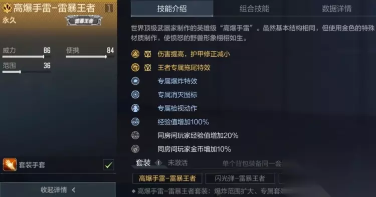 技能解读 高爆手雷-雷暴王者核心技能为基础伤害提升与护甲修正降低,无震屏效果,搭载王者专属投掷拖尾特效,其核心优势是针对高护甲目标的伤害优化,虽牺牲部分护甲系数,却强化了对厚重防护敌人的压制力,搭配雷暴套装可小幅扩大爆炸范围。