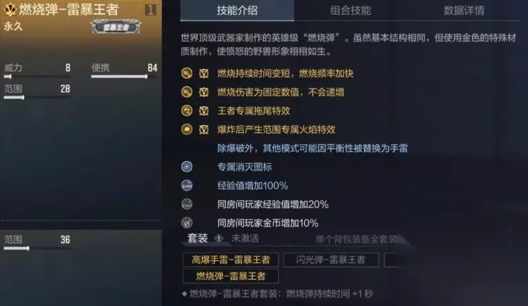技能解读 燃烧弹-雷暴王者主打固定高伤机制,区别于普通燃烧弹的伤害递增模式,全程保持固定伤害,同时燃烧频率加快、持续时间略短,拥有王者专属投掷拖尾,搭配雷暴投掷套装可延长1秒燃烧时间,弥补持续伤害时长短板,实战中能快速消耗敌人血量。
