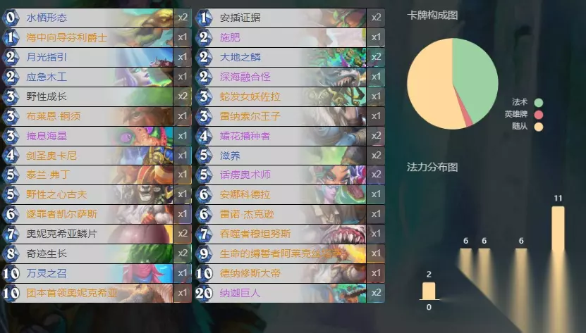AAECAZ8FBJHsA+CLBLCyBIbiBA3M6wPj6wPw9gPQrATTvQTXvQTavQTi0wTa2QSA4gSB4gSF4gS55AQA 为什么叫光铸骑,因为整套牌都是圣骑士的职业卡组。配合像女伯爵和势力精英打收益,以及利用神圣法术体系进行补强。整套牌来说,实力是尚可的。唯一怕的是卡手,因为整套牌过牌不是特别多,更多的像是发现。 德鲁伊:大帝跳费德