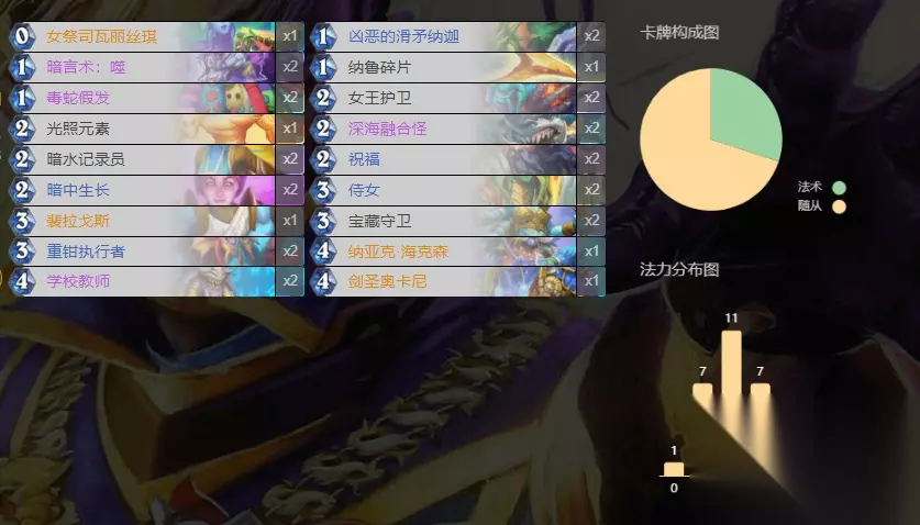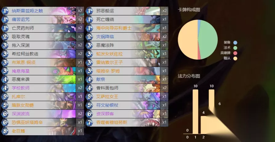 AAECAf0GEoUXpu8DvfEDgfsDgvsDsJEEsZ8EgqAE5qAE5bAEjbUE27kE5r0E9ccE9c4EltQEh+oEl+8EC97EAsD5A4P7A8WABOegBPysBP60BJa3BNy9BOK9BP/ZBAA= 类似于手牌术的打法,前期尽量攒手牌,对手如果下怪能解就解。发力期在中后期,利用罗姆和女勋爵配合拖入深渊,铜须和佐拉进一步增加诅咒频率。过牌可以利用灾祸配合邪恶船运或者恶魔法阵。可以考虑带个任务,打内战必备神卡。同时要注意诅咒频率,适当可以宝对手牌,但是也要避免被对手卡手牌上不了诅咒。 牧师:假发牧