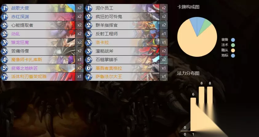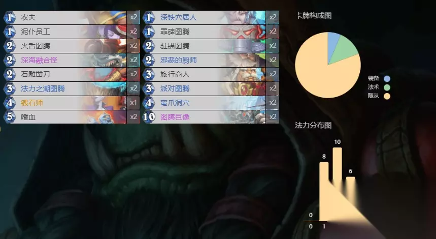 AAECAQcG/OgDle0Dqu4DgdwEiN8E6/AEDPboA43tA9XxA6GNBLysBJzUBLzbBP/bBL7iBLbjBKXkBImDBQA= 低费曲线以高质量暴怒和相关随从为主。配合洛卡拉以及动乱,往往能打出一波清场外加一波场攻很高的情况。卡扎库斯可以换过牌或者吼爹,我是为了提升容错带的。带反射工程师是为了改变剑娘和奥格拉屁股大的局面。毕竟10/4的剑娘我可抵不住这诱惑。如果怕扛不住那就配合动乱,至少打出去了就肯定不会亏。 萨满:图腾萨