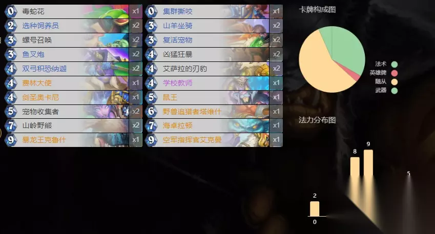 AAECAaoIAbHZBA/wB5MJivQD9PYD25QE/58E4aQE+rQEssEEqtkEttwEpeQEveUExOUE3e0EAA== 还是整体以低费曲线为主,打前期的铺场和快攻。再利用锻石师和嗜血打爆发otk。卡组上比较多变。可以换掉一些低费曲线变成冷风和雪落,打控制体系。同时也可以带荧光配合随从铺场打法术体系。 猎人:野兽变速猎