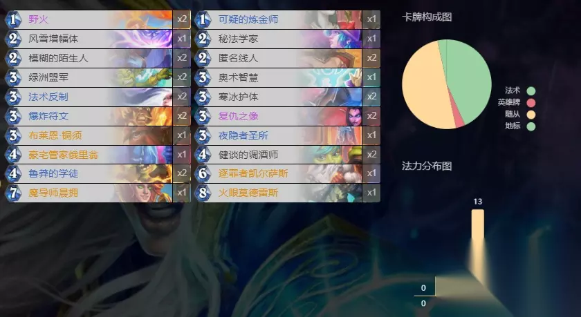 AAECAaIHAvylBPbdBA6o6wOt7gP+7gPT8wOm9QPr9gP2nwT3nwS3swTj0wTc2gT03QT13QTBgwUA 唯一的制胜点在于德拉卡,利用放贷鲨鱼配合亡语,以及低费的曲线和一手的减肥卡,在一回合内用掉足够多的牌。从而触发德拉卡的战吼,往往能打出意想不到的otk,相信奇迹吧。 法师:奥秘火冲法
