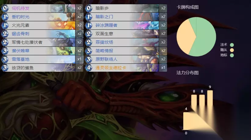 AAECAR8K5u4DyvsDlPwD25EE4Z8E2qMEx7IElrcE57kEm8kECurpA8X7A72gBNejBOWkBMCsBMC5BIPIBIHJBITJBAA= 节奏上比起一般的野兽猎更慢,中期发力。利用刃豹和鱼叉炮配合找高费野兽,或者也能配合费林拉降费了的巨型(绝大多数巨型都是野兽)。双弓娜迦配合凶猛狂暴和复活进一步扩大场面优势,以及后续作战能力。我感觉前期弱了一点以外,中期的发力节奏很强。 潜行者:奇迹贼