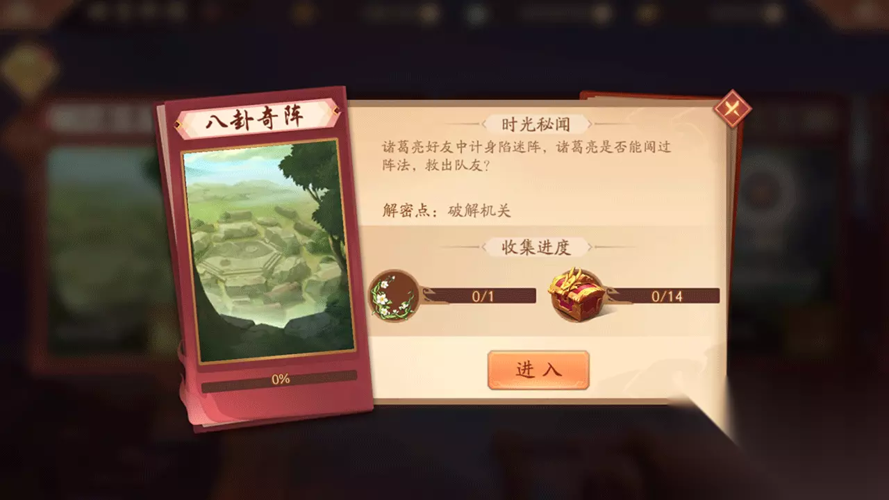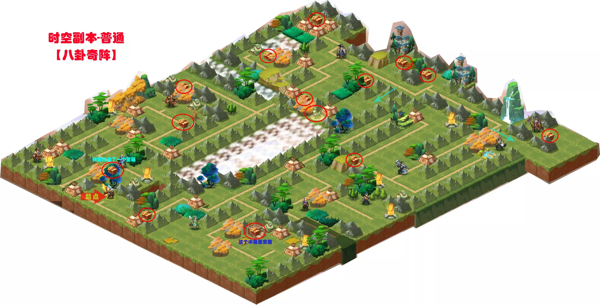 本章宝物:月瑶枝 本章宝箱数量:14个 通关宝典:有一个宝箱隐藏在树荫下遮挡处,还有一个宝箱伪装成了箱子;按照机关逐步通关即可 「地图」 本次为大家带来时空外传·普通9【八卦奇阵】通关攻略,先给大家看下本章节带有宝箱的地图,大家可以尝试放大观看,大家能直接看到宝箱所在地。