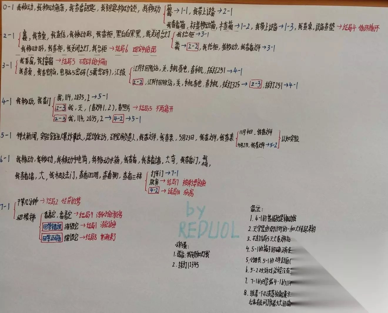 《水箱》全结局攻略 结局一 第七章选择砸灯塔(被医疗人员救醒,却似乎依然在水箱里) 结局二 第七章不爬楼梯放置一段时间(当作一场梦醒来) 结局三 第三章面对窗户持续“查看窗户”,直到出现“撞”字,组成“撞窗户”,连续撞窗户(发现水箱内存在多个时空的自己) 结局四循环循环 第一章木箱使用“标签移动箱”获取“木”,使用木查箱获得完好箱子带设备,第二章中设备可出现,在客厅“查看桌”“设备查(看)垫”给设备充电后带上(发现水箱循环) 结局五 在第二章从桌子下和床下发现钥匙和锁,第三章节电脑中单独看“报道”,获得325号码,手机充电后拨通再按剧情推进,第四章通过检查门,从门上得到数字,(我移动后数字会倒数)得到“一”后,组成“一火”灭火后查看照片。(相信自己有家人,进入水箱的假象) 结局六现实中的现 第二章不看信完成衣服整理、关台灯、抬动柜子所有操作(会发现自己似乎已经做过很多次,从逃出者变为写信帮助其他“我”逃出) 结局七 第六章墙上拼凑出“椅”和“木”字,靠近门,站在椅子上使用“木敲击门”后开启剧情,选择不开门(放弃抵抗并意识到自己是水箱里濒死的鱼) 结局八 第七章爬上楼梯选择砸灯塔,前提条件是在电话信息核对时候回答正确:114-2035-2(似乎被成功救出到真实世界,却无法完全消灭水箱) 结局九 同为第七章爬上楼梯选择不砸灯塔两次(被灯塔吸引与水箱融为一体) 结局十 参考结局五,第二章从桌子个床下发现八音盒,第三章拨打325,但第四章中不救火(救火进看照片会进入结局五),最后按结局一内容走完全程。(发现我在病房中,又或者这是水箱的另一个假象)