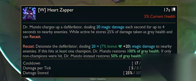 电击疗法 冷却时间:17/16.5/16/15.5/15秒 消耗:当前健康的5% 蒙多博士给除颤器充电,每秒钟对附近的敌人造成20/35/50/65/80魔法伤害,持续4秒钟。激活后,他会将所受伤害的25/30/35/40/45%储存为灰色生命值,并可以再次施法。 重新施放:引爆除颤器,对附近的敌人造成20/35/50/65/80(额外生命值7%)魔法伤害。如果这个效果击中至少一个敌人英雄,那么蒙多医生会恢复100%的灰色生命值。如果只有非英雄单位被击中,蒙多博士将恢复50%的灰色生命值。