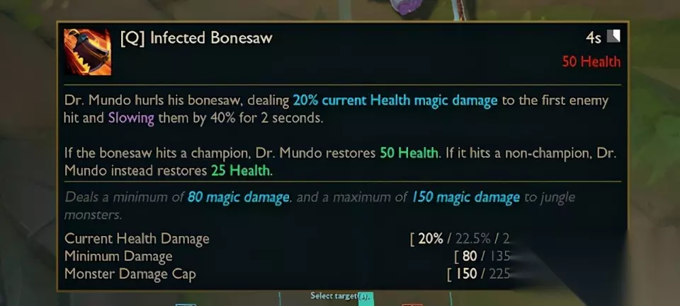 【问】病毒屠刀 冷却时间:4秒 消耗:50马力 蒙多博士投掷了一把被病菌污染的骨锯,对第一次命中的敌人造成20/22.5/25/27.5/30%的魔法伤害,并造成40%减速2秒。 如果骨锯击中英雄,蒙多医生会恢复50点生命值。如果骨锯击中非英雄单位,蒙多博士将恢复25点生命。 对野怪造成至少80/135/190/245/300魔法伤害,最多150/225/300/375/450魔法伤害