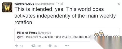 对于世界BOSS突然刷新的情况,国外有玩家@了魔兽的官方推特,询问该BOSS的刷新机制是否为独立的。对此官方回应这个BOSS的刷新时间和一般BOSS的每周刷新确实不同,刷新CD也是独立计算的。所以该BOSS的刷新应该是不影响之后的世界BOSS正常刷新,不过因为所有服务器的维护都还没有开始,所以无法确认新CD是否还会有世界BOSS出现。但是这样看来,目前所有人都还没有见过真面目的世界BOSS鬼母阿娜应该也是同样的刷新机制,并不按照一周一个的排序刷新。