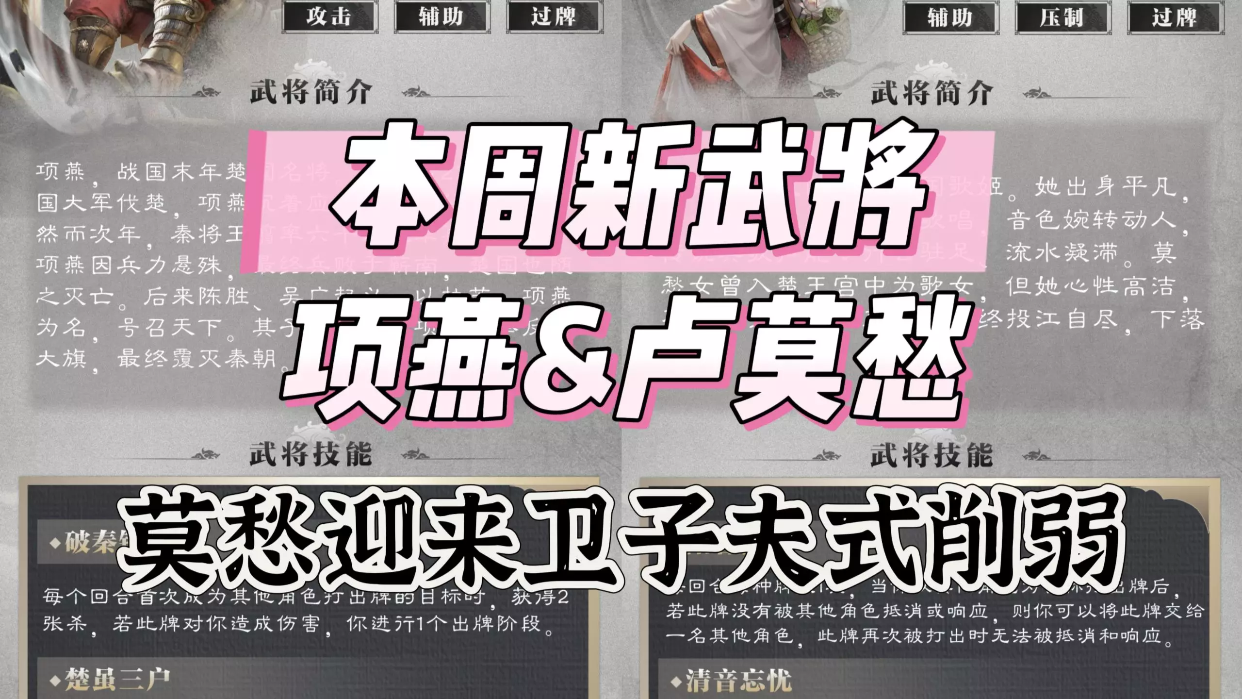 这是《名将杀》3.30策划推文的解读内容,对新武将项燕进行了技能介绍,项燕是楚阵营史诗武将,拥有3手牌6体力上限,技能为破秦锋锐和楚虽三户,同时还提及了新武将卢莫愁。