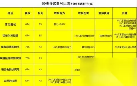 套装没有集齐时,可以先使用50级悲鸣首饰套装,待史诗套装集齐时再换上50级史诗首饰套装。 ③50级史诗武器 魔法师50级史诗武器一共10件,4件以物理输出为主,其余6件以魔法输出为主(扫把类武器两把)。