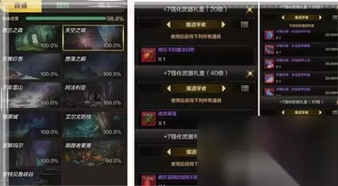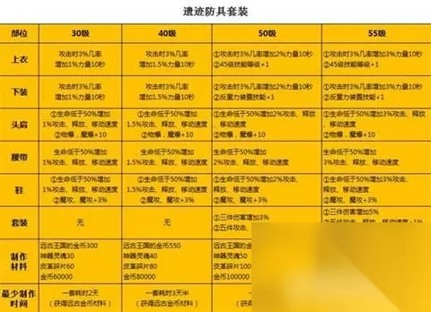 ② 刷图S评分礼包:当角色升级到30级(此时会开启远古-遗迹1地图)以上时刷图会有点吃力,这时候结合刷图获得的S评分分数,可以领取到强化+7装备礼包。 二、中期装备选择 当角色进入30级达成相应成就,就可以开始征战远古地图了,我们的中期装备都从远古地图中产出。 ① 战争之王防具装备 分为30级、40级、50级以及55级真-套装。后面等级装备以前一级装备为制作基础。55级真-套装需要在遗迹2图中获取对应材料,以50级装备为制作基础进行制作。