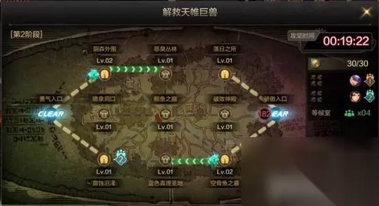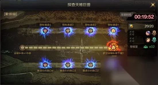强力队伍打法:适用于队伍整体装备水平较强 1队依次通关-隐秘通道1→隐秘通道2→隐秘通道3→隐秘通道4 另1队依次通关被遗忘的路口1→ 被遗忘的路口2→ 被遗忘的路口3→ 被遗忘的路口4 即可通关! 偏弱队伍打法:适用于队伍整体装备水平偏弱 其中稍强的队先打护卫运输队地下城→运输队阻止总部削弱上下两条路线中的怪。 再依次通关-隐秘通道1→隐秘通道2→隐秘通道3→隐秘通道4 另1队依次通关被遗忘的路口1→ 被遗忘的路口2→ 被遗忘的路口3→ 被遗忘的路口4 即可通关! 通关运输护卫队地下城1-2-3-4,可以对应Y轴弱化上下2条路线中的怪物 通关运输护卫队地下城1和运输队阻止总部。可以弱化所有一阶段所有怪物。所以不要问中间的运输护卫队地下城2-3为什么不打,因为直接打总部全部都弱化了,去打运输护卫队地下城2-3-4根本就是多此一举。 2、团本2阶段打法详解与流程 团本最复杂的阶段,应该也是拦住住了无数勇士的一个阶段。独特的机制,和强大的移动BOSS,让无数玩家头疼不已。今天就让剑痴来给你详细解读团本2阶段-解救天帷巨兽。 共分为11个地图,攻坚时间20分钟,2阶段复活币使用限制全队30个。如图:
