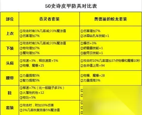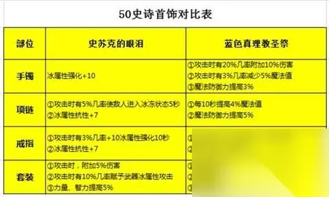 ① 50级史诗防具 通过上图分析可得,吞灵者套装和奥德丽的蛟龙套装综合属性奇虎相当,不论你拥有哪一套,都可以穿戴起来,作为当前版本的最终套装。 ② 50级首饰套装 首饰套装分为史苏克的眼泪首饰套装和蓝色真理圣祭首饰套装。前者以围绕冰属性、增加伤害、提高智力为主,后者以增加魔防和提高伤害为主。