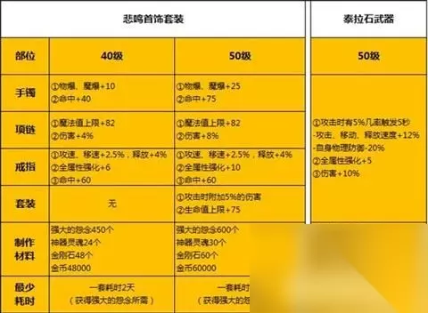 ② 悲鸣首饰装备、泰拉石武器具体首饰属性及套装属性请看下图。