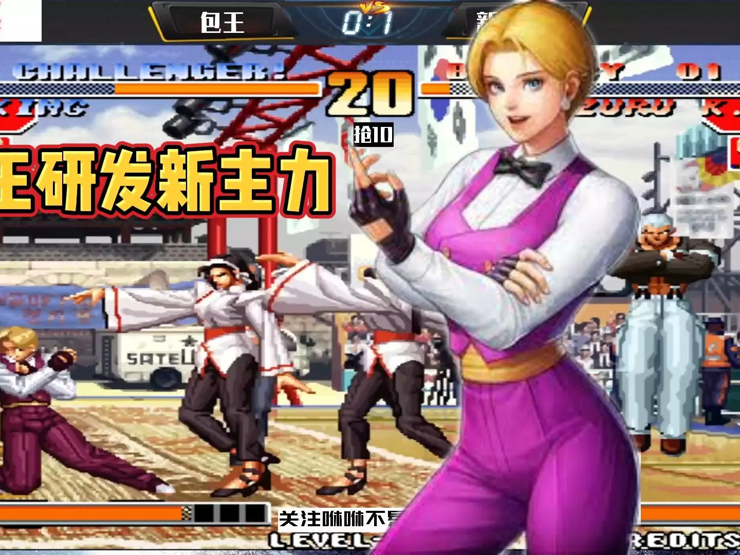 这是一则《拳皇97》游戏解说内容,展示了苦练一年多《拳皇97》的美女玩家阿若,对战玩家夜枫的对局,夜枫放言用五弱角色就能拿捏对方,呈现了精彩的对战画面。