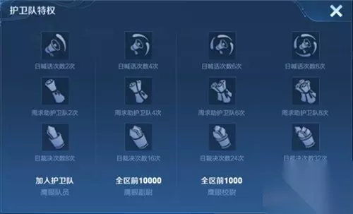 加入鹰眼护卫队后,就是鹰眼队员了,而后面的三个等级是有要求的。 等级分别是区排行榜达到前一万名,区排行榜前一千名,区排行榜前一百名。也就是说鹰眼大将需要全区前100的玩家才可以获得。 不同等级的护卫队员,获得权益也不同。等级越高,每周可求助护卫队的次数越多,每天可以视频裁决的局数也越多。 鹰眼大将的权益是每天喊话的次数8次,每周求助护卫队的次数8次,每日裁决的次数有32次。 可以看出鹰眼大将的权益比之前的三个等级高出了不少。
