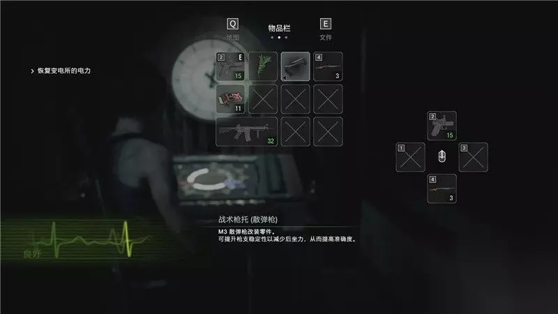 功能界面 物品栏 物品栏由方格组成,普通物品会占用1格空间。 较大的物品,例如冲锋枪或其它重型枪械,将会占到两格空间。 主角初始的物品栏为8格,你可以在游戏中找到额外的物品挎包,增加额外的容量。 武器栏可自由分配4种武器,你可以使用键盘或手柄键,快速切换它们。左边显示了角色目前的生命状况,绿色心跳表示良好,橘黄色表示一般,红色表示危险。 同时,当角色进入危险生命状态时,会出现捂住伤口,行走蹒跚等动作,以此提示你角色需要赶紧救助。