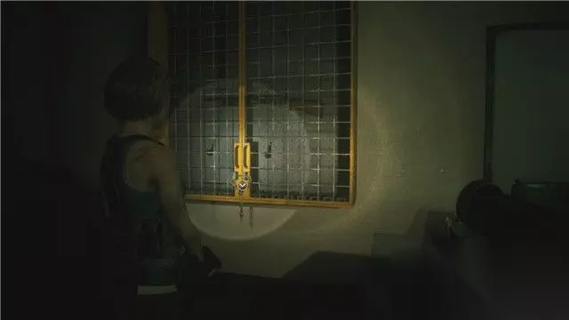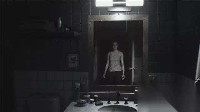 推开卫生间的门,吉尔从镜子中发现自己已感染了T病毒,成为一副僵尸模样。