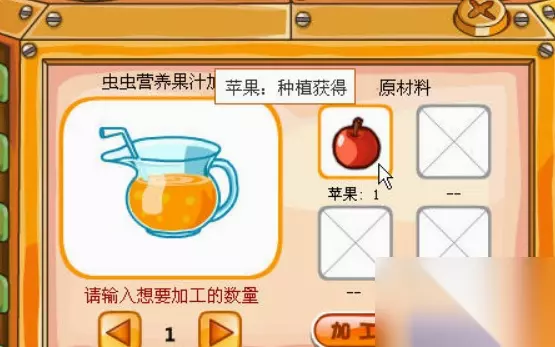 2、果汁的材料就是苹果,不做就得先栽苹果树采收苹果,苹果种子可从农场兄弟三个小屋里麻袋里捡来,花了钱自然就行。 3、挑选果汁,每只果汁耗用一个苹果,做好之后可在牧场饲料栏放入虫虫营养果汁。
