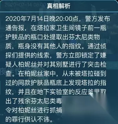 白色死神真相解析 2020年7月14日晚20时,警方发布通告称,塔拉浴室镜子前的一瓶护肤品瓶口中提取出芬太尼类物质,瓶身未发现他人指纹。通过侦探提供的线索,警方立即锁定了嫌疑人伯妮斯,并对她的别墅进行了突击检查。在伯尼斯的家中,塔拉的指纹被发现在塔拉从未接触过的同一个护肤瓶的底部,残留的芬太尼药物也被从地下实验室的反应器中取出。警方立即下令逮捕伯妮丝,她对自己的罪行供认不讳。