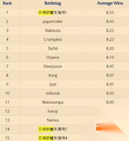 完整榜单:会长开分身 排名 ID 均胜 1 安德罗妮来屠榜1 8.53 2 paperroller 8.43 3 Rakisuta 8.23 4 Crumpled 8.23 5 Tachii 8.20 6 Chance 8.10 7 Deerjason 8.07 8 Vung 8.07 9 Zyst 8.07 10 mifundi 8.03 11 Walaoumpa 8.03 12 haoqi 8.00 13 Neirea 8.00 14 安德罗妮来屠榜7 7.97 15 安德罗妮来屠榜4 7.93 16 Cliff86 7.93 17 安德罗妮来屠榜2 7.90 18 臭臭地精 7.90 19 Ownerism 7.90 20 dreads 7.90 21 安德罗妮来屠榜3 7.87 22 liimujx 7.87 23 jtchampion 7.83 24 BDBRINGA 7.83 25 Lebaron 7.83 26 enslen 7.83 27 安德罗妮来屠榜8 7.80 28 ZapKanon 7.80 29 JDavey 7.77 30 安德罗妮来屠榜5 7.77 31 Celeritas 7.77 32 安德罗妮来屠榜6 7.77 33 IceWind 7.67 34 Hafu 7.67 35 Reickl 7.67 36 jeffwest 7.63 37 inoval 7.63 38 Comber 7.60 39 BoardAndFox1 7.60 40 duane 7.57 41 PJPhily 7.57 42 nutshells 7.57 43 Dentalcannon 7.57 44 Inakil 7.57 45 Polarin 7.57 46 安德罗妮屠榜10 7.53 47 LordOfD 7.53 48 Boardandfox3 7.53 49 skatgib1 7.50 50 ShiangChen 7.50 51 安德罗妮屠榜11 7.50 52 Figjam 7.50 53 Souse 7.47 54 Cinnamon 7.47 55 Niv 7.47 56 bigdaddyman 7.47 57 Behemoth 7.43 58 dragonbone 7.43 59 eillen 7.43 60 Aetherics 7.43 61 BoardAndFox 7.43 62 dueky 7.40 63 安德罗妮屠榜18 7.40 64 Esaibid 7.40 65 DMOC 7.40 66 Sage 7.40 67 InvincibleXI 7.40 68 Midget 7.37 69 LuckyPants 7.37 70 Jaeroman 7.37 71 spritecan 7.37 72 jakesdabest 7.37 73 human 7.37 74 Zamos 7.37 75 MushroomGas 7.33 76 Strycerxxx 7.33 77 Amdir 7.33 78 Fennecat 7.33 79 MaverickVan 7.33 80 安德罗妮屠榜20 7.33 81 Karmademon 7.33 82 Reuzer 7.33 83 kbrules7 7.33 84 GiveMeBoar 7.30 85 Achenar 7.30 86 sundrew 7.30 87 JTsexkik 7.30 88 Roxsas 7.30 89 Serpico 7.30 90 Isherwood 7.27 91 CaptainKeen 7.27 92 PrinceFancy 7.27 93 ankurg 7.27 94 JeromeKelvin 7.27 95 ven0m 7.27 96 MeowBoZi 7.27 97 わさわさ 7.27 98 Richuen 7.27 99 Dylonion 7.23 100 Zartres10 7.23 101 Huahwi529 7.23 102 OhNoes 7.23 103 BiffalloBuff 7.23 104 ひなない 7.20 105 iEatGiraffes 7.20 106 pach 7.20 107 Hambo 7.20 108 Tony 7.20 109 JerkAlpha 7.20 110 beefmachine 7.20 111 NinjaSniPAH 7.20 112 nchin122 7.20 113 blackmamba13 7.17 114 Chuxin 7.17 115 Foi 7.17 116 NoD 7.17 117 SpoonFork420 7.17 118 iltiratore 7.17 119 Kaizor 7.17 120 Billy 7.17 121 Sure 7.17 122 Envy 7.17 123 Kripparrian 7.17 124 Brian 7.17 125 Tempter 7.17 126 Ashoka 7.17 127 whiterhino 7.17 128 OsoDeKoala 7.17 129 Taihyo 7.13 130 SilentStorm 7.13 131 MeowRosicky 7.13 132 安德罗妮屠榜12 7.13 133 安德罗妮屠榜13 7.13 134 Laslod 7.13 135 H1tscanHer0 7.13 136 Nosna 7.13 137 Taurus 7.13 138 Ath 7.13 139 Hoyviken 7.10 140 Pal 7.10 141 appleking 7.10 142 Farroway 7.10 143 ArenaMania 7.10 144 Wacotaco 7.10 145 Drareg 7.10 146 Horo 7.10 147 headshot 7.10 148 Undyne 7.07 149 m0rph1ing 7.07 150 Pigjr101 7.07 据悉其实榜单上只有一个真会长,大概在61名左右,其他都是喵星人军师。 但是还是要提一句:胜利!属于神抽狗协会! (狗和猫的故事是说不完的。。。)
