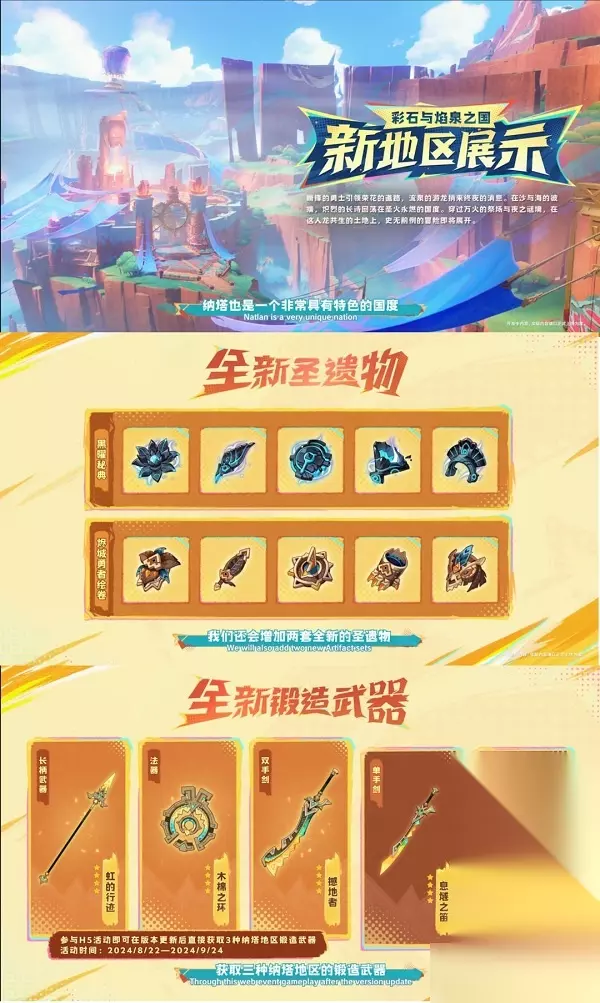 六、版本活动 本次前瞻没有对版本活动进行详细介绍,从汇总图来看,版本大活动和纳塔探索有关,参与版本大活动可以获得一个四星法器。 此外,七圣召唤也将更新,还会有新的纳塔牌背等待大家获取。 [1][2]下一页在本页阅读全文