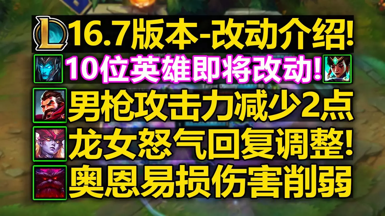 16.7版本[完整改动]介绍:男枪攻击力减少2点!奥恩易损削弱!龙女怒气回复调整! 绿毛在此感谢大家的支持,祝大家排位上大分,天天好心情(=・ω・=)