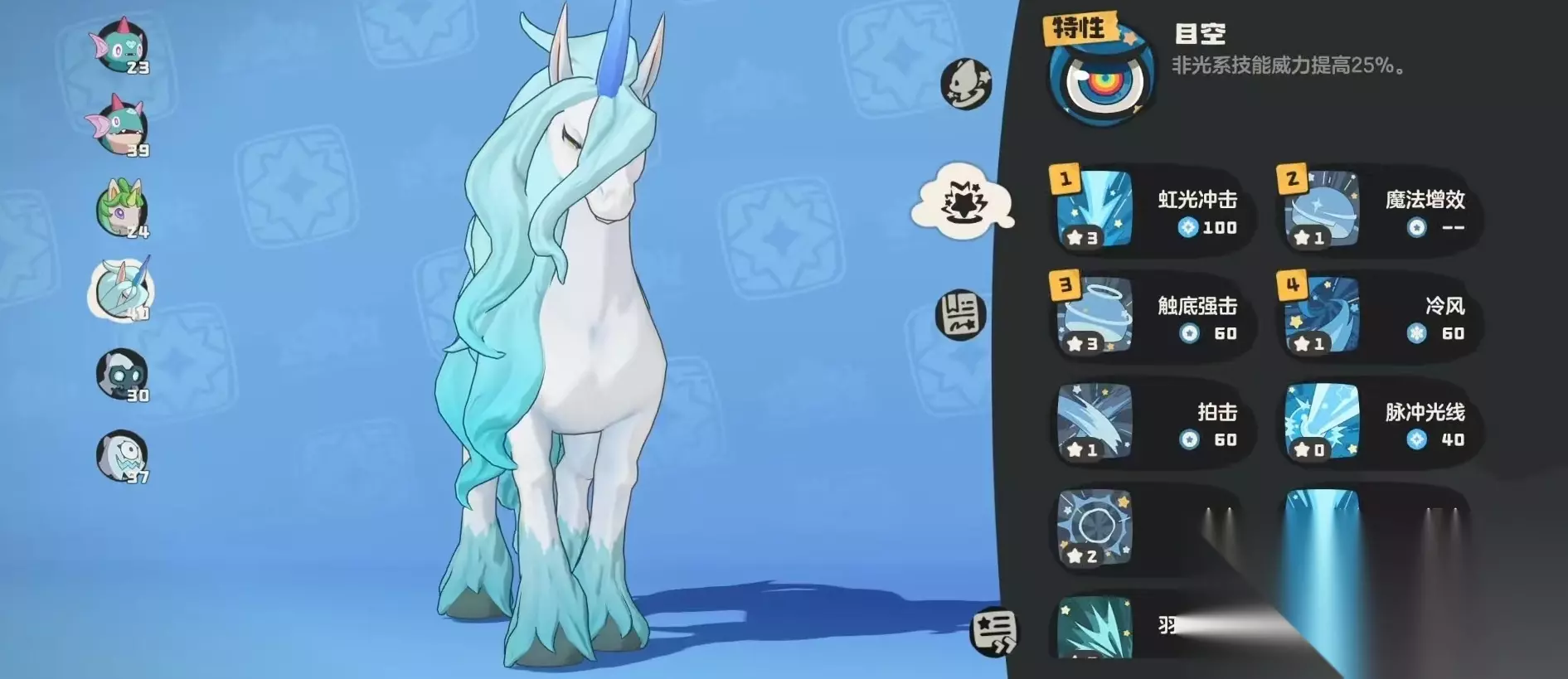 在技能搭配选择上,为了能够突出自身的特点,当然是以魔法攻为主。小编的搭配是虹光冲击、魔法增效、触底强击和冷风这四个,搭配的思路是强化输出能力。冷风,造成魔法伤害,威力60。虹光冲击,威力100,对敌方精灵造成高额魔法伤害。触底强击,威力60,造成魔法伤害,如果释放后能量耗尽,本次攻击威力加100。魔法增效,直接提升80%魔攻。这样搭配起来,再配合上自身属性上的优势,甚至可以对敌方进行一击秒杀。