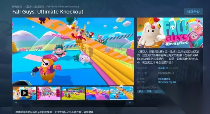 2、玩家如果想要在Steam上下载这款游戏,可以搜索英文名Fall Guys或者Fall Guys: Ultimate Knockout。