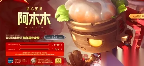 3. 免费阿木木皮肤 活动时间:1月21日 - 2月28日 活动入口:>>>点击进入活动页面<<< 活动内容:玩家可以通过参与活动,免费领取阿木木皮肤,感受这只可爱的英雄的新春装扮。