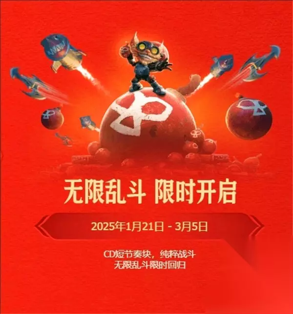 4. 无限乱斗 活动时间:1月21日 - 3月5日 游玩入口:客户端参与 活动内容:春节期间,参与无限乱斗模式,享受更加狂野和轻松的游戏体验,放松心情,体验乱斗的乐趣。