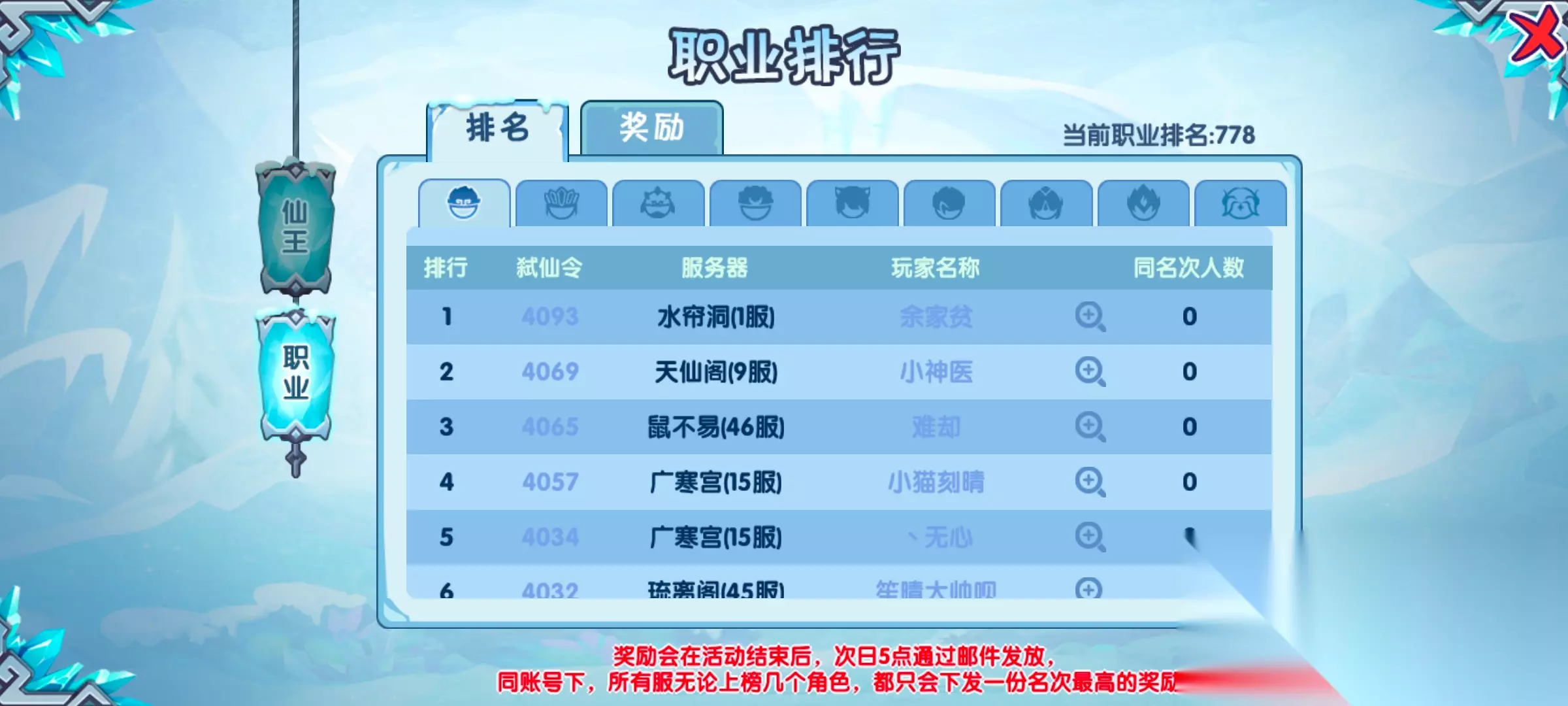 排行,就是可以看其他顶尖玩家的【弑神令】获取数量及排名奖励,同时也可以在右上角看到自己的当前排名。