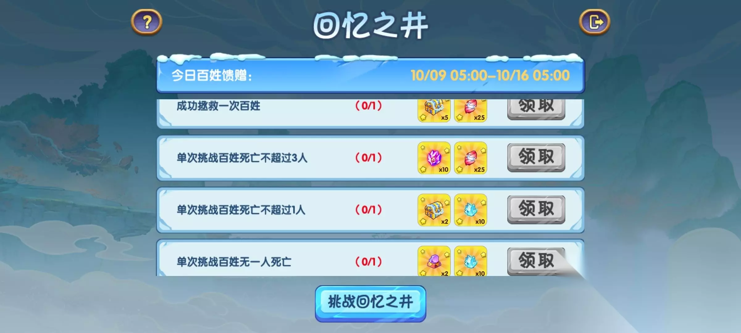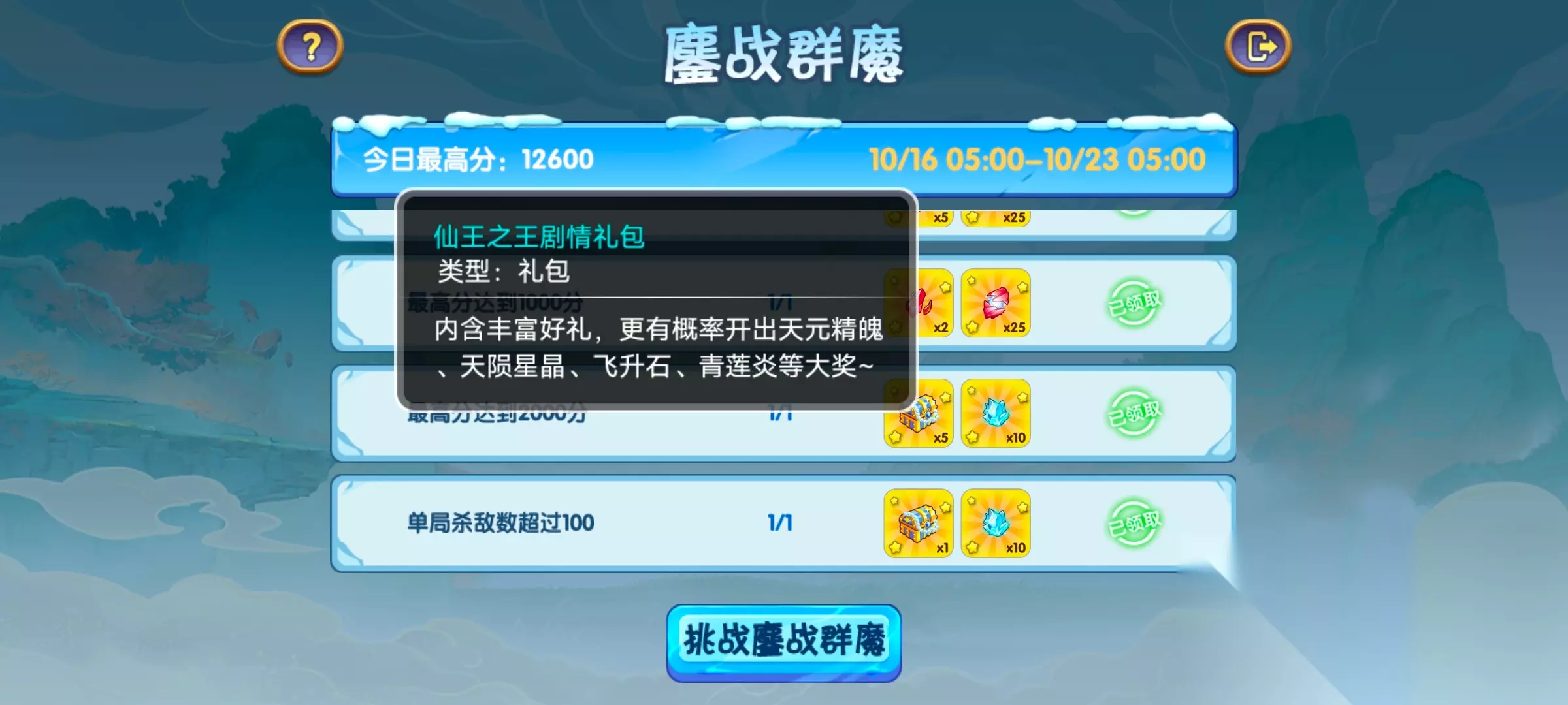 回忆之井部分持续一星期,期间每天都会有几个任务,在通关并达成这些目标后即可获取奖励。 宝箱奖励一般是仙王之王剧情礼包、八仙碎片礼包、至尊碎片礼包、飞升礼包l、飞升青莲碎片自选礼包这些。 至于其他的道具奖励,大家看图也能明白。 鏖战群魔