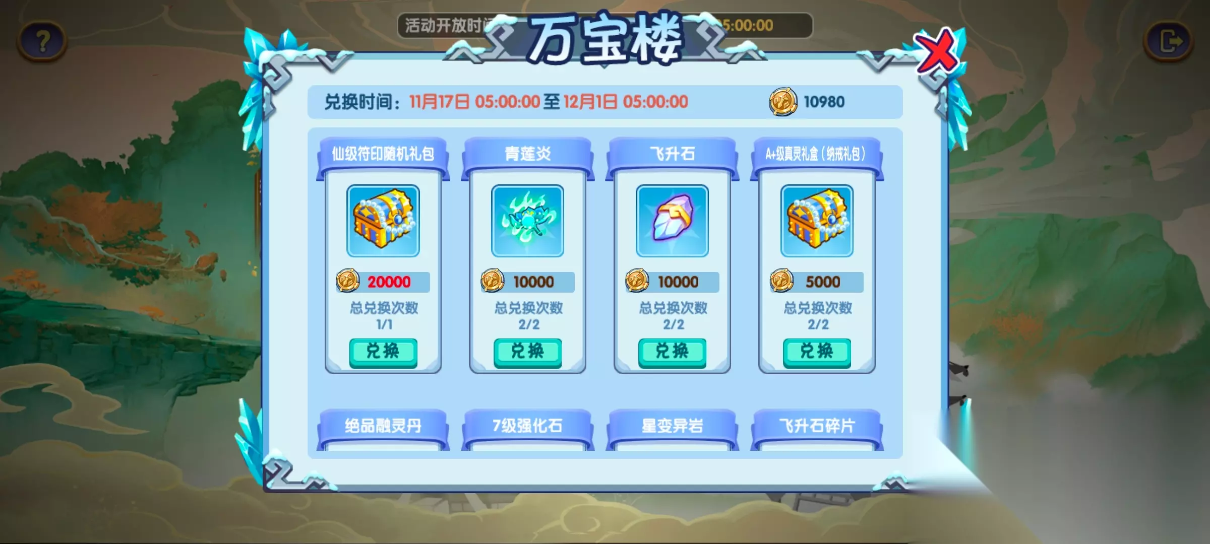 最后是我们的重头戏——万宝楼介绍了。我们通过各方面获取的【仙灵币】,可以在这里换取需要的奖励。 不过万宝楼只会在活动的最后一周以及活动结束后的一周内开放,即开放两周,我们有充足的时间进行兑换,不必担心。 【仙灵币】获取 首先,我们来计算一下普通玩家能获取多少【仙灵币】吧: 1.虚天裂缝8个关卡通关奖励2800币。 2.虚天裂缝累计分数奖励,按照平均每关80分来算,就是2100币。(有能力拿更高分的自己计算时候加上就行) 3.情报室每日奖励,天天拉满,应该会开启23天,总共就是3450币。(有错误的话请及时在评论区提醒我) 4.斩仙台段位奖励,达到金仙1星总共可以获得20200币奖励。达不到的话自己在计算的时候减去即可。 战力不足百万的玩家,如果怕段位提升不上去的话,可以按1万左右进行估算。 5.排行结算奖励,也就是500-1000这样子,基本上可以忽略不计,普通玩家按500计算吧。 总共笼统地计算下来,高战玩家拉满可以获得3万左右【仙灵币】奖励,普通玩家能有个1.5万——2万左右【仙灵币】。 兑换商店奖励 为了方便大家的观看,我直接把商店道具的内容整理成表格给大家展示出来: