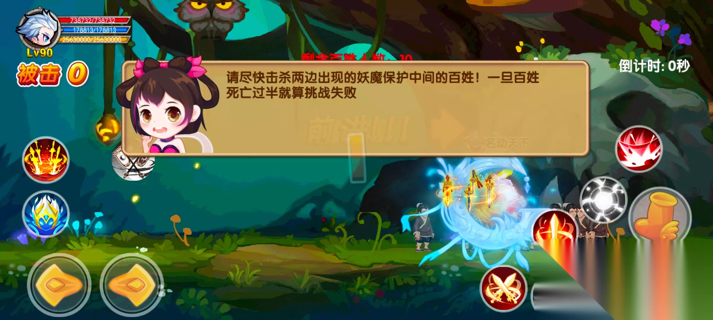 简单来说就是给你一个战斗场景,场景两边会不断刷出来怪物,在规定时间内保护村民不受怪物的攻击即可取得胜利。 这个活动一般来说没啥难度,属性够了随便放技能就行了。 只不过有一点需要注意,偶尔会出现“百姓精神错乱,敌我不分”的负面buff,遇到这种情况就得注意技能的释放时机,不能打到这些百姓,不然百姓直接就寄了。 最好的解决办法就是找个离百姓远一点的位置,等怪物聚到一起了再集中解决。 怪物对我们的仇恨是大于百姓的,所以不用太担心另一边的怪物会攻击百姓。 如果怪物实在是喜欢百姓而不来找自己,那就带上鬼袍时装吸引仇恨即可。