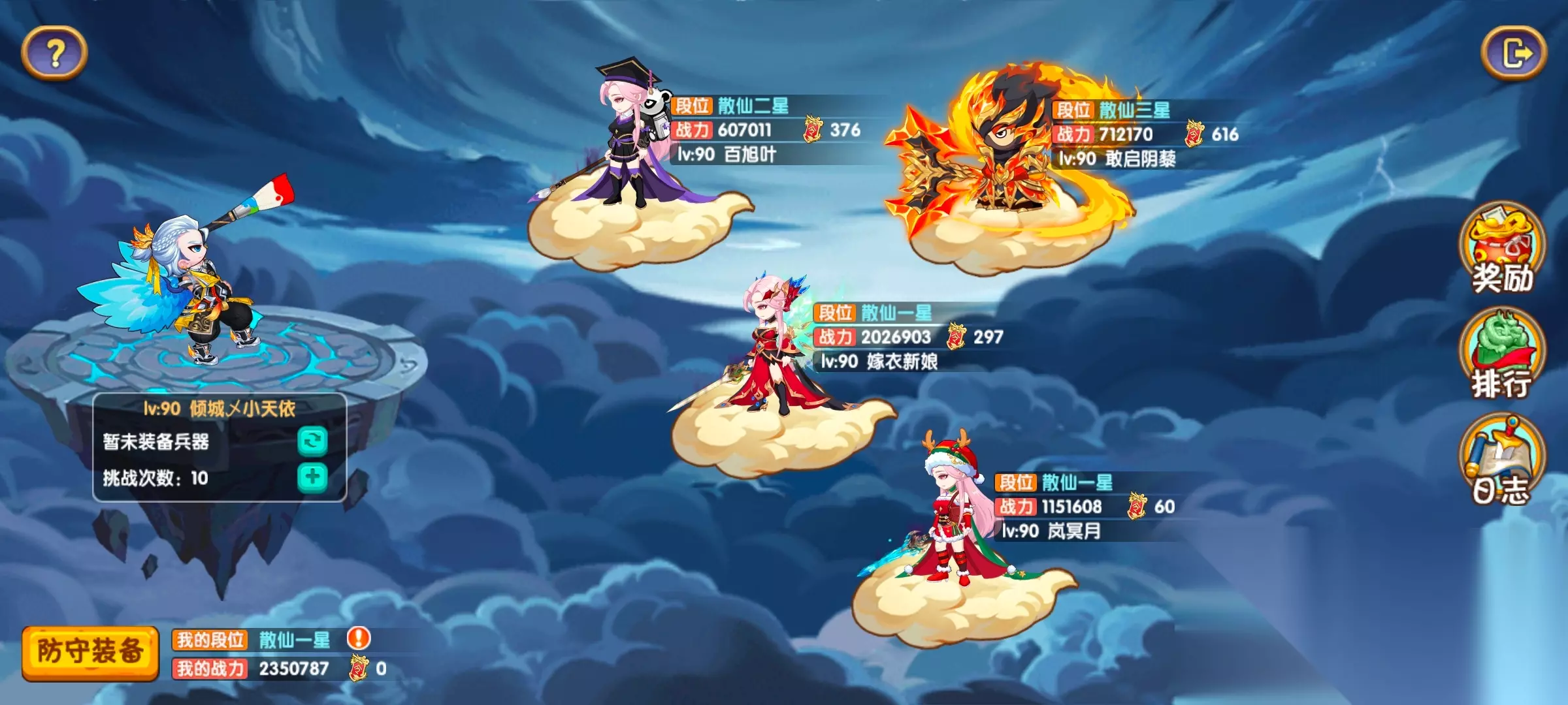 斩仙台推出后的第二天解锁兵器系统,在斩仙台界面,点击挑战次数“+”上面的图标即可进入。兵器可以给我们的进攻和防守提供一些帮助。 具体效果可以在游戏中点击图标查看,我这里就不赘述了,我个人推荐进攻时使用刀和盾,防守时使用盾和鞭。 如果你有自己的搭配,那就按自己的想法来即可。 斩仙台右侧还有仨图标:奖励、排行、日志。