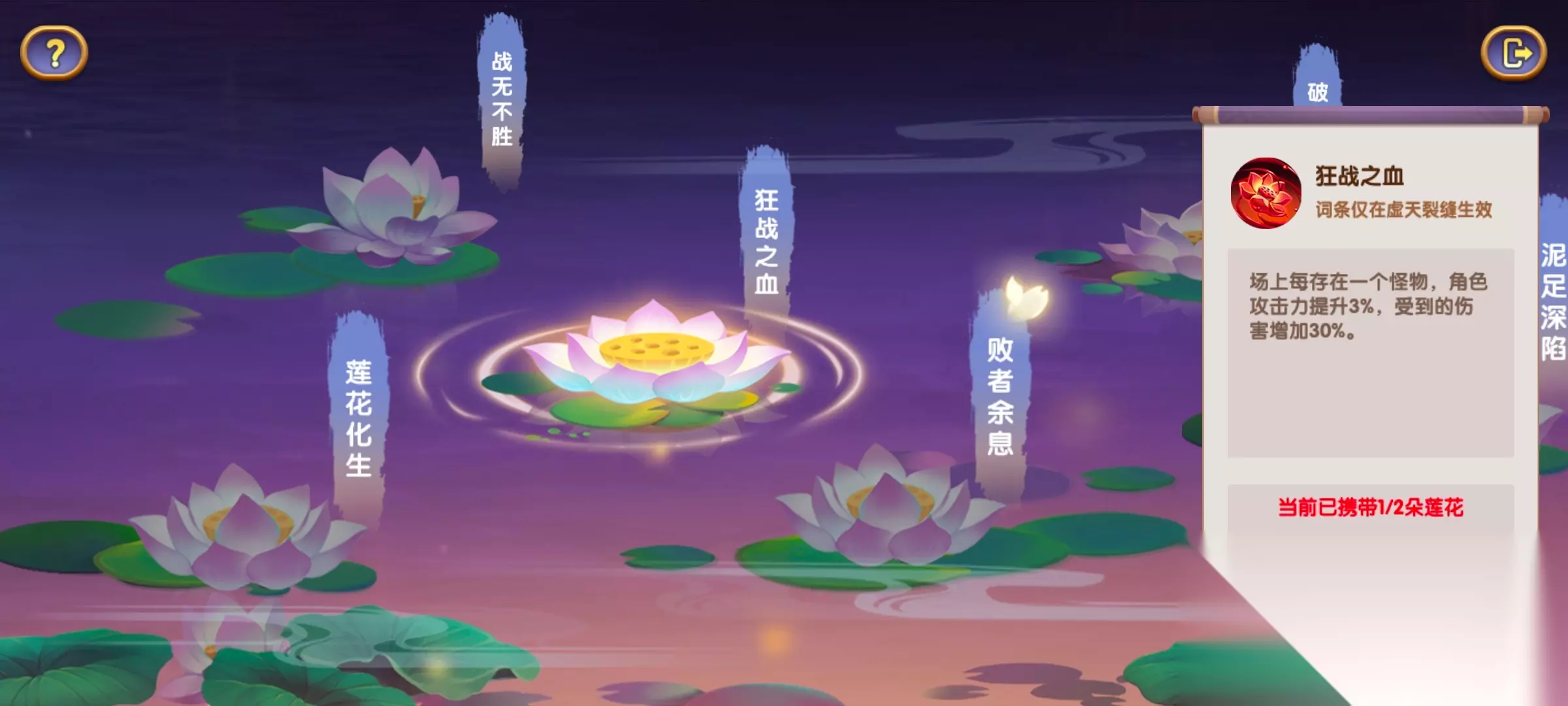 这个没啥好说的,就是一些可以携带的buff,提升自己在虚天裂缝的作战能力。推荐带狂战之血和败者余息,对于速刷有一点帮助。 斩仙台
