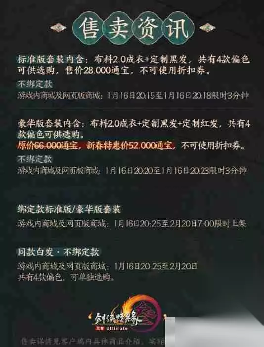 套装信息: 本次成衣套装提供标准版和豪华版两种选择。 豪华版包含定制红发,标准版则包含定制黑发,白发需单独购买。 标准版售价28000通宝,豪华版特惠价52000通宝,均不可使用折扣券。