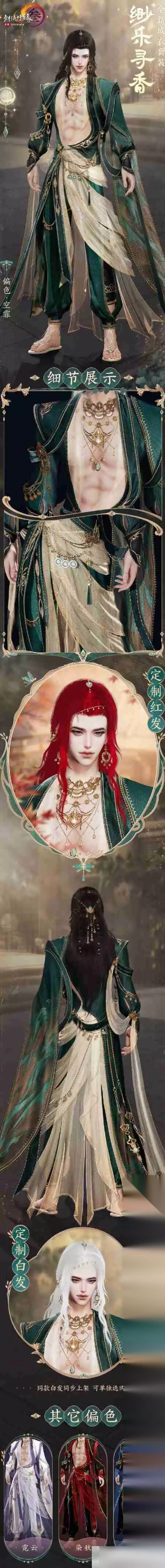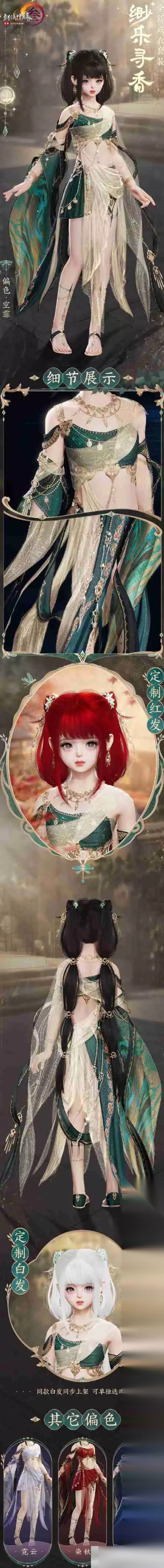 “缈乐寻香”外观一览: “缈乐寻香”套装主色调为绿色和淡金色,并提供多种颜色选择。豪华版更包含专属定制红发! 限时抢购: 豪华版:2025年1月16日20:20-20:23 (限时3分钟) 标准版:2025年1月16日20:15-20:18 (限时3分钟) 绑定和白发:2025年1月16日20:25-2月20日7:00 外观展示: 成男