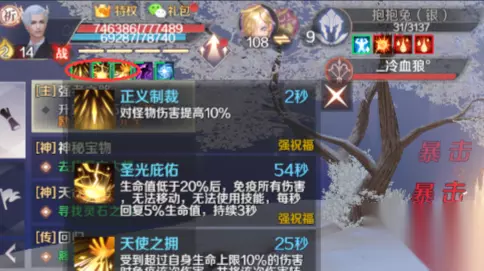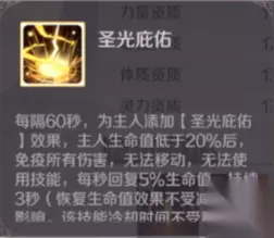 核心3技能:满级效果46秒一次圣光庇佑,就相当于46秒1次免疫伤害。这个技能当你血量低于20%就会免疫所有伤害3秒,每秒给你恢复5%生命值。但是有弊端,这3秒期间不受任何治疗,也无法移动,更加不能使用技能,但是可以嗑药,所以下本的话可以保命,寰宇的话就相当于等死给队友拖时间! (这个技能固定内置CD,不受内置CD影响46秒一次我是不建议吃满的 核心12技能可以优先吃)