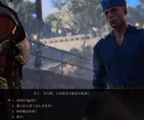 3、接下来去任务提示地点,与灰色海港处的渔夫戈万进行交谈,他位于灰色海港传送点的楼梯处。这里与他的第一个选项选1,可以引出后续剧情的选项。并可以询问怪物所在地的线索。