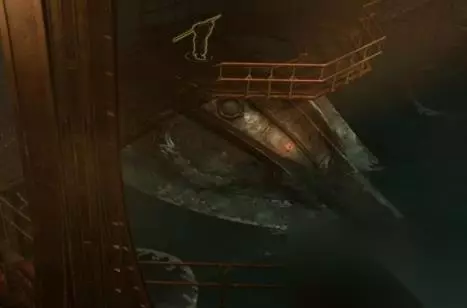 9、长廊左手处的门可以到达蓄水池边,在这里我们可以找到矮人红锤和他的潜水艇。