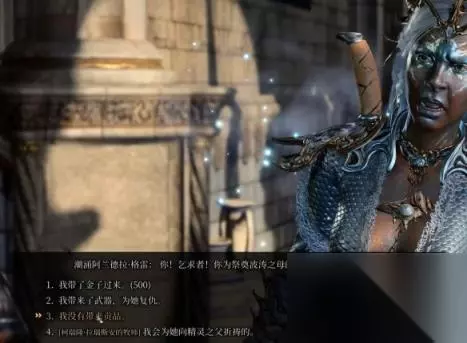 3、与潮涌阿兰德拉格雷交流进行第一次选项时,如果玩家种族为卓尔精灵,并且职业为牧师,技能是精神类法术,便会解锁隐藏选项4(该选项也可以进行正常的下一段剧情,相当于省500块)如果不是的话还是推荐选1
