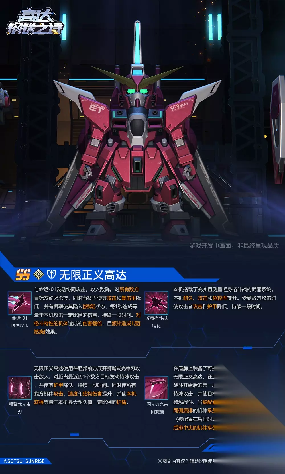 狮鹫式光束刃 技能效果(3级): 无限正义高达使用在胫部前方展开狮鹫式光束刃攻击敌人。对距离最近的1个敌方目标发动特殊攻击,并使其护甲降低,持续一段时间。同时使所有我方机体攻击、速度和结构伤害提升,并使本机获得等量于本机最大耐久值一定比例的护盾。 前瞻效果,请以正式上线版本为准