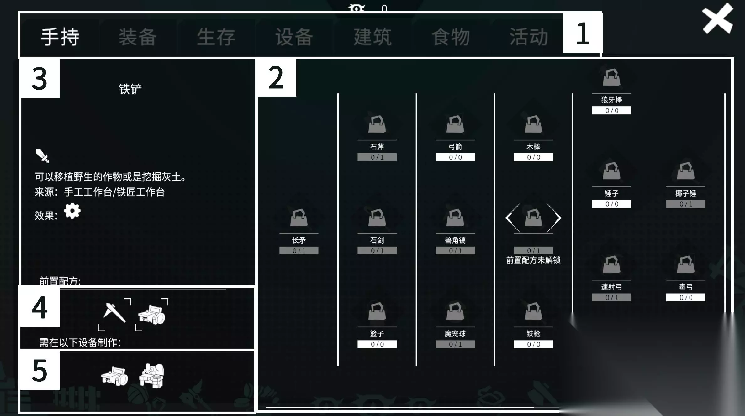 ①记忆分组: 根据记忆的作用,将记忆分为七类:手持、装备、生存、设备、建筑、食物及节日活动 ②记忆列表: 选中记忆分组中的全部记忆会展示在这里。 ③详细信息: 选中记忆,左侧将会展示其详细信息。 ④前置记忆: 某些记忆需要先解锁前置记忆后才能被解锁,纳闷为什么点不了解锁的时候可以注意一下哦。(点击前置记忆的图标,就能跳转至该前置记忆的详情啦) ⑤合成设备: 某些记忆需要通过特定的设备加工合成物品。 【想象力获取】 游戏中最重要的元素就是想象力啦,梦境世界里没有想象力可是寸步难行哦,刚刚提到的解锁记忆就需要它!想象力数值可在画面上方中部查看,那么如何获取想象力呢?