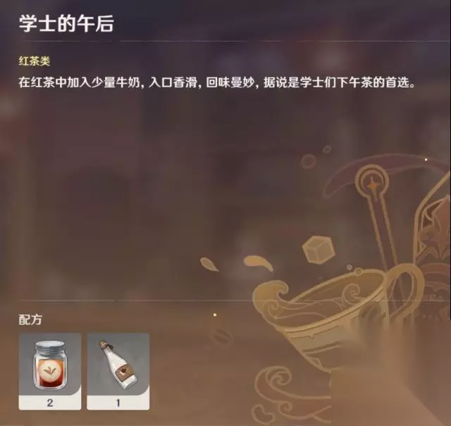 红茶 1.学士的午后:红茶x2+牛奶 2.北风之望:红茶+牛奶+薄荷 3.酸沁光辉:红茶x2+柠檬 4.烟霞蔽芾:红茶x3 5.明冠:红茶+牛奶x2 6.情诗:红茶+牛奶+焦糖酱 7.欢声笑语:红茶+牛奶+可可酱